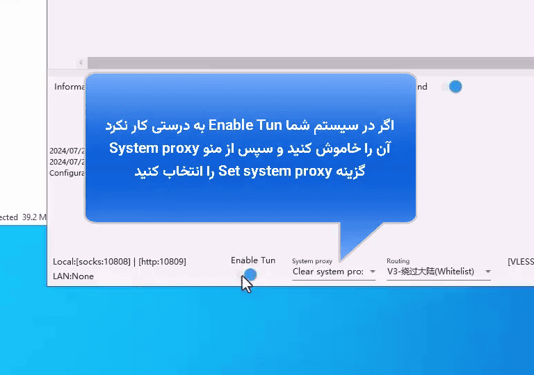 جهت اتصال به VPN مطابق با تصویر "Enable Tun" را روشن کنید. اگر در سیستم شما "Enable Tun" به درستی کار نکرد، آن را خاموش کنید و سپس از منو "System proxy" گزینه "Set system proxy" را انتخاب کنید.